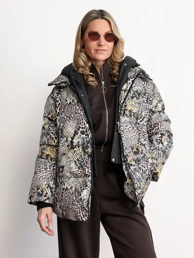 Пуховик с абстрактным принтом черного цвета с капюшоном-манишкой