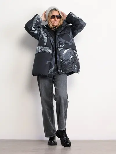 Пуховик с цветочным принтом синего цвета с капюшоном