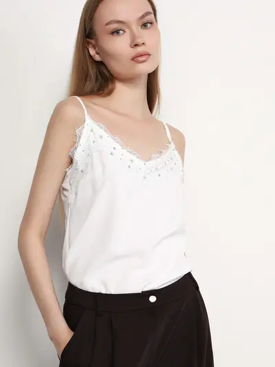 Топ коричневого цвета с кружевом и цепочкой-мониль